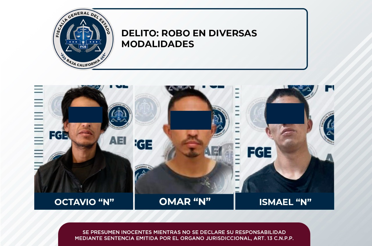 TIJUANA, B. C. - Como resultado de información recabada de gabinete y campo, tres hombres fueron aprehendidos en Tijuana por elementos de la Fiscalía General del Estado y es que están relacionados a robos en diversas modalidades.