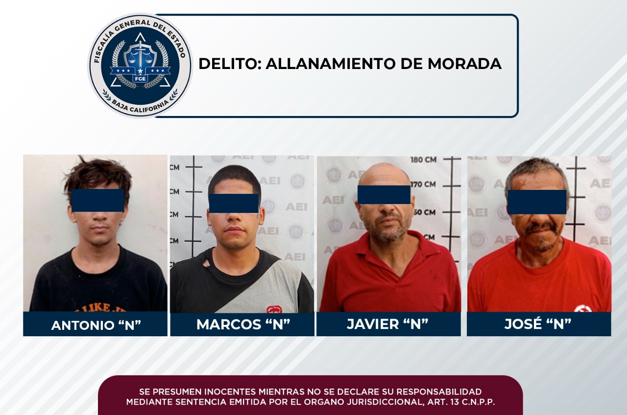 MEXICALI, B. C. - Cuatro hombres relacionados en el delito de allanamiento de morada, fueron vinculados a proceso con base a las pruebas y argumentos presentados por la Fiscalía Regional de Mexicali, a través de la Unidad de Investigación con detenidos Poniente.