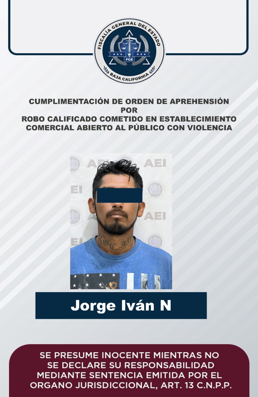 MEXICALI, B. C. - La Agencia Estatal de Investigación (AEI), adscrita a la Fiscalía Regional de Mexicali, con base al trabajo realizado por la Unidad de Investigación de Robos Oriente en la integración de la carpeta de investigación, logró la detención de Jorge Iván “N”, quien contaban con orden de aprehensión por el delito de robo calificado cometido en establecimiento comercial abierto al público con violencia.
