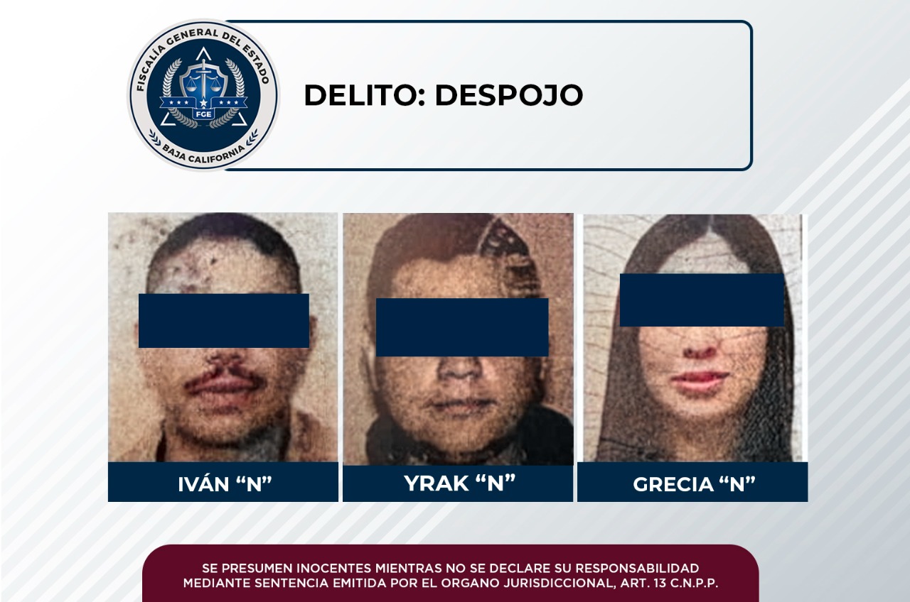 PLAYAS DE ROSARITO, B. C. - Con base a los datos expuestos por la Fiscalía Regional de Playas de Rosarito, por la probable participación en hechos que la ley señala como delito de despojo, fueron vinculados a proceso Grecia “N”, Iván “N” e Yrak “N”.