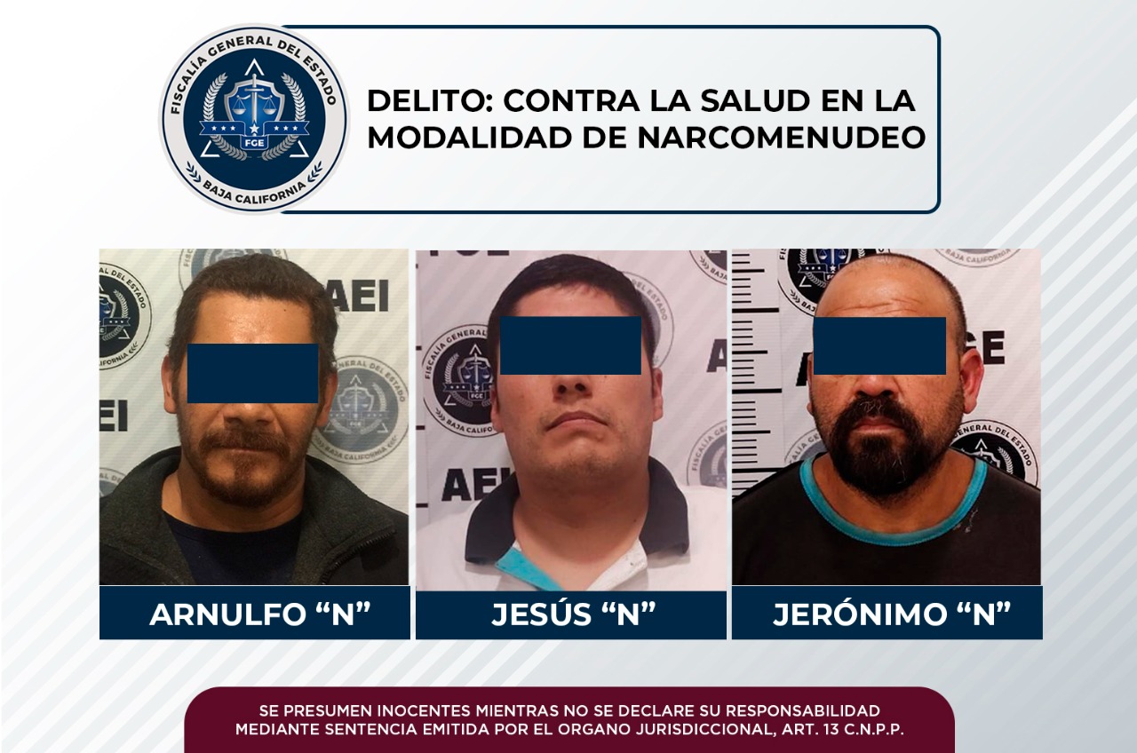 TIJUANA, B. C. - Tras información recabada en gabinete y campo, elementos de la Fiscalía General del Estado cumplimentaron, en días pasados y en diversas áreas de Tijuana, órdenes de aprehensión a tres hombres por su probable comisión en el delito contra la salud.