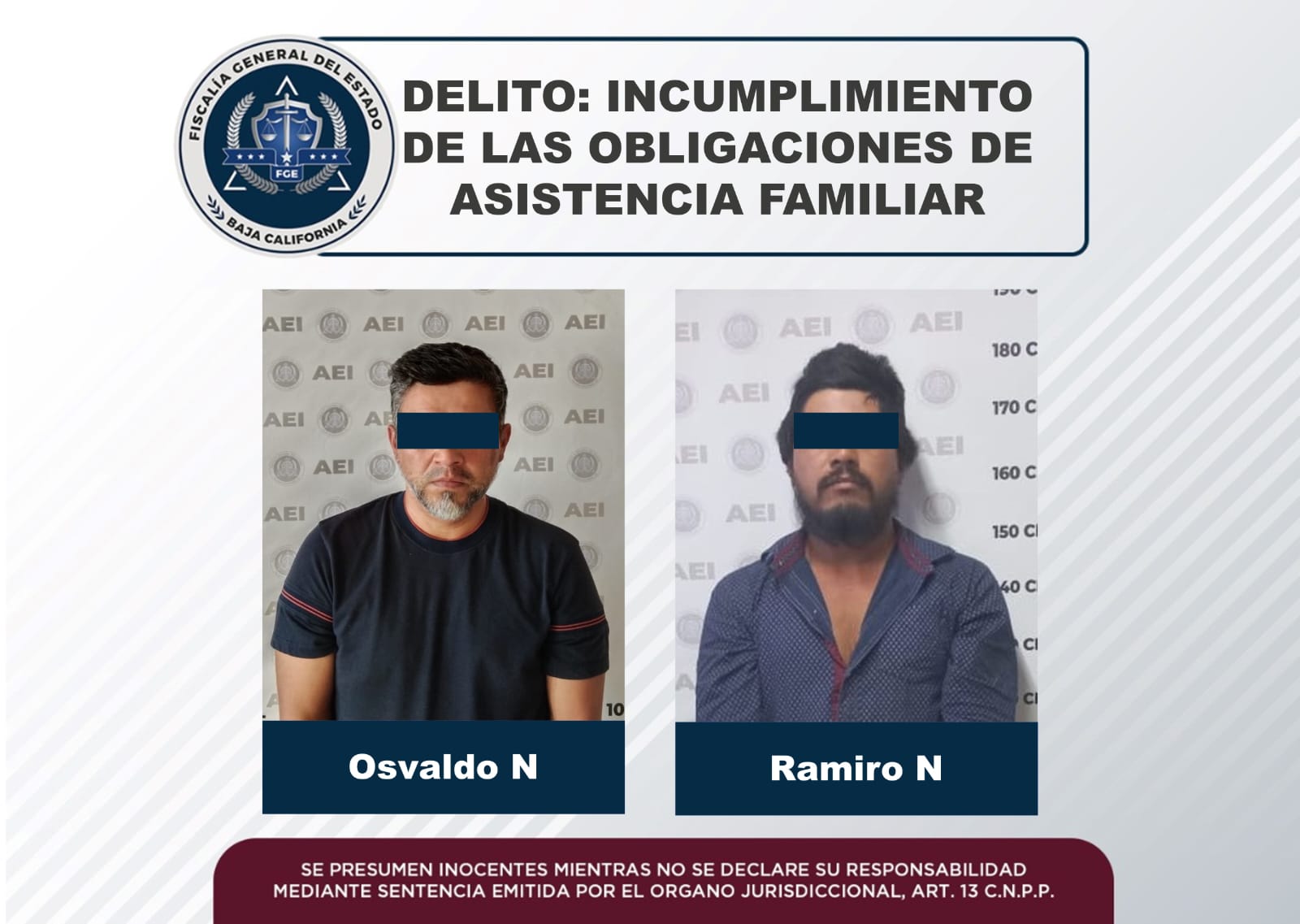 ENSENADA, B. C. - La Fiscalía General del Estado, a través de oficiales de la Agencia Estatal de Investigación, detuvo a dos personas de sexo masculino sobre los que pesaba orden de aprehensión por el delito de incumplimiento de las obligaciones de asistencia familiar.