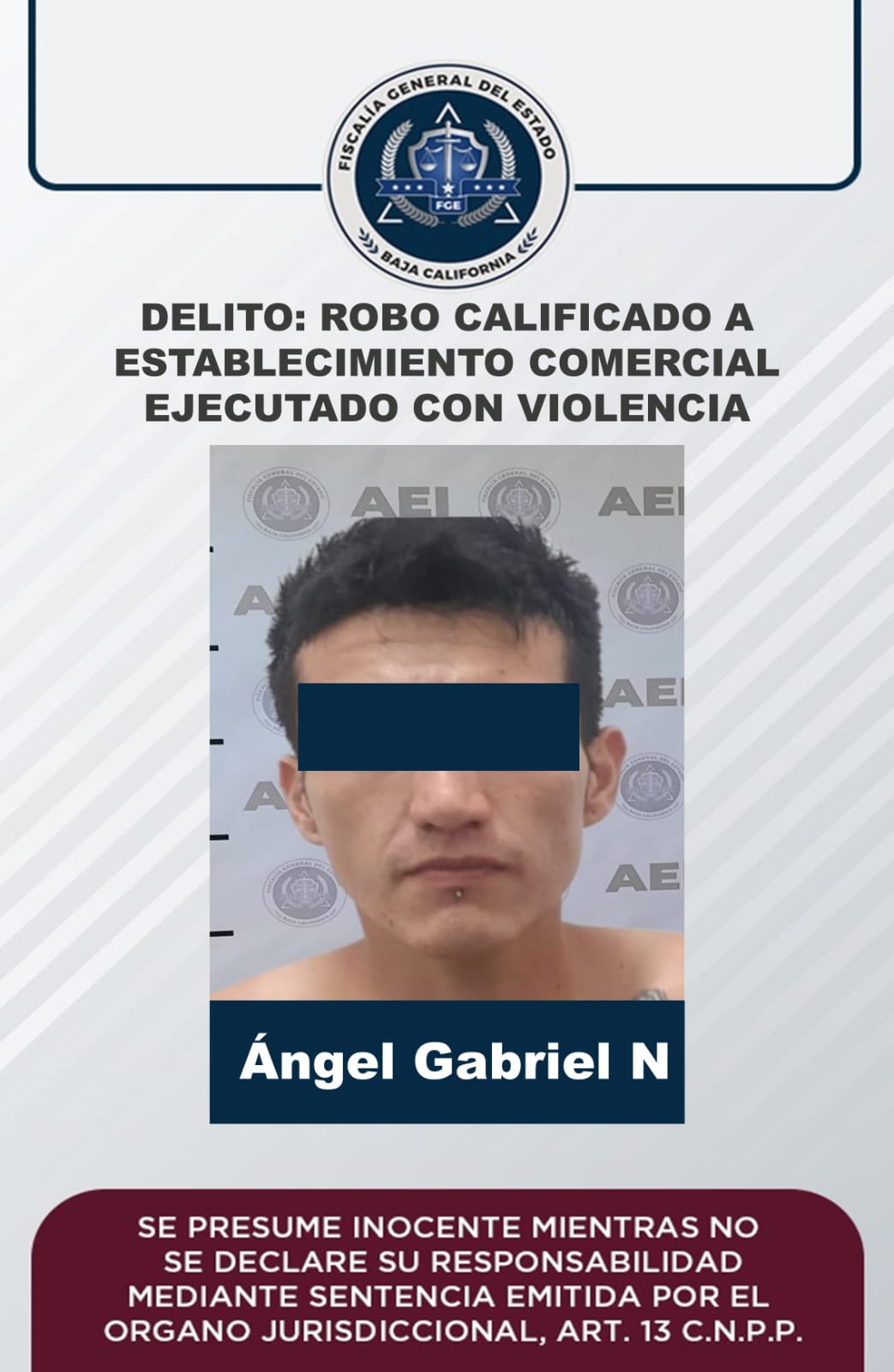 ENSENADA, B. C. - La Fiscalía Regional de Ensenada logró la vinculación a proceso de un presunto implicado en dos robos con violencia suscitados durante el presente año en un centro cambiario y otro establecimiento comercial de la localidad.