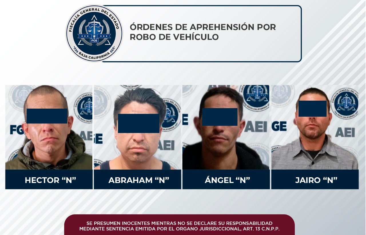 TIJUANA, B. C. - La Fiscalía Regional de Tijuana, a través de Agentes Estatales de Investigación (AEI) del Grupo de Aprehensiones, logró la captura de cuatro personas que contaban con mandamientos judiciales activos en su contra por el delito de robo de vehículo en diferentes modalidades.