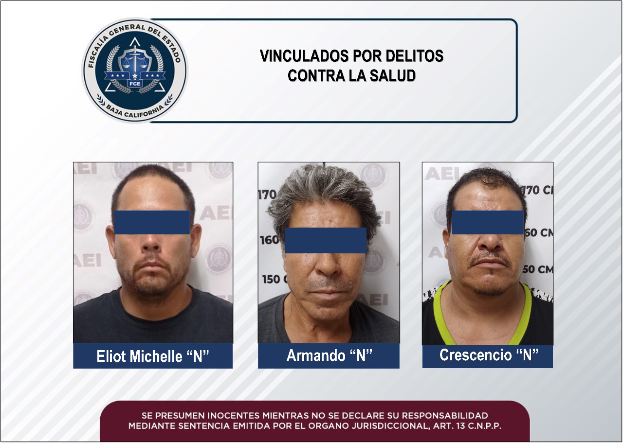 MEXICALI, B.C. - La Fiscalía General del Estado (FGE), a través de la Fiscalía Especializada en Narcomenudeo obtuvo la vinculación a proceso de tres sujetos por el delito contra la salud.