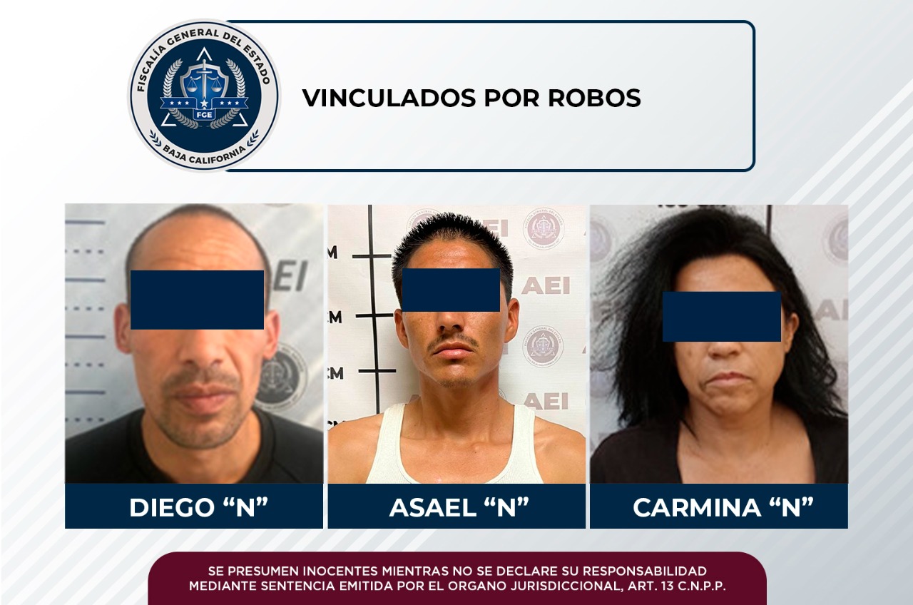 MEXICALI, B.C. - 25 DE OCTUBRE DE 2022.- Tres personas relacionadas en robos, fueron vinculados a proceso, con base a las pruebas presentadas por la Fiscalía Regional de Mexicali, través de las Unidades de Investigación de Robos Oriente, Unidad de Robos Poniente y Unidad con Detenidos Poniente.
