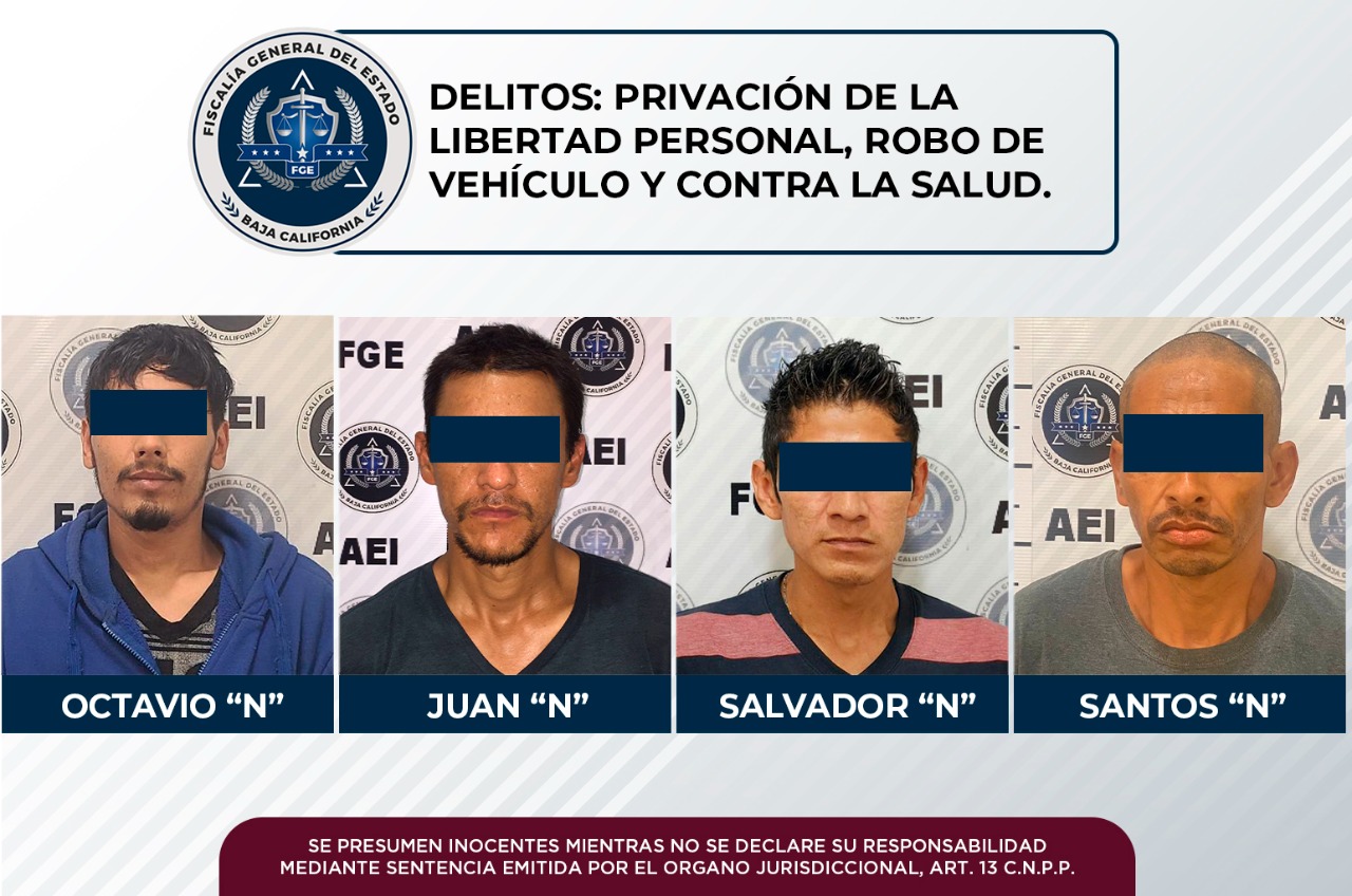 TIJUANA, B.C. - Tras información recabada en gabinete y campo, agentes investigadores de la Fiscalía General del Estado, cumplimentaron cuatro órdenes de aprehensión, a igual número de personas, por los delitos de privación de la libertad personal, robo de vehículo y contra la salud en la modalidad de narcomenudeo.