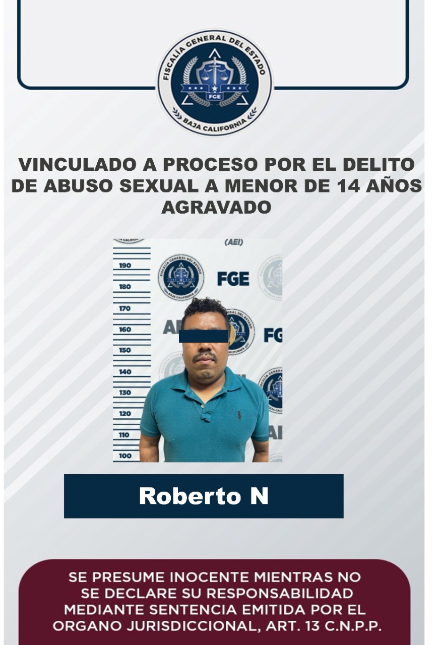 MEXICALI, B.C. - La Fiscalía General del Estado, a través de la Fiscalía Especializada en Delitos Contra la Mujer por Razón de Género, obtuvo la vinculación a proceso penal de Roberto “N”, por el delito de abuso sexual a menor de 14 años agravado.