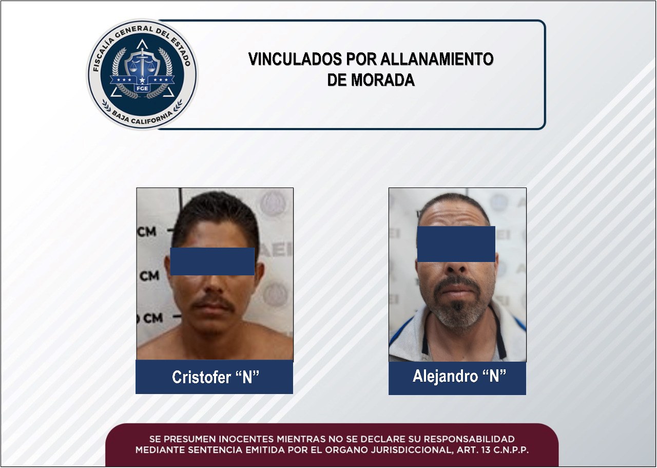 MEXICALI, B.C. - 26 DE OCTUBRE DE 2022.- A través de audiencias por separado la Fiscalía Regional de Mexicali a través de la Unidad de Investigación con Detenidos Poniente, obtuvo la vinculación a proceso de dos sujetos por el delito de allanamiento de morada.