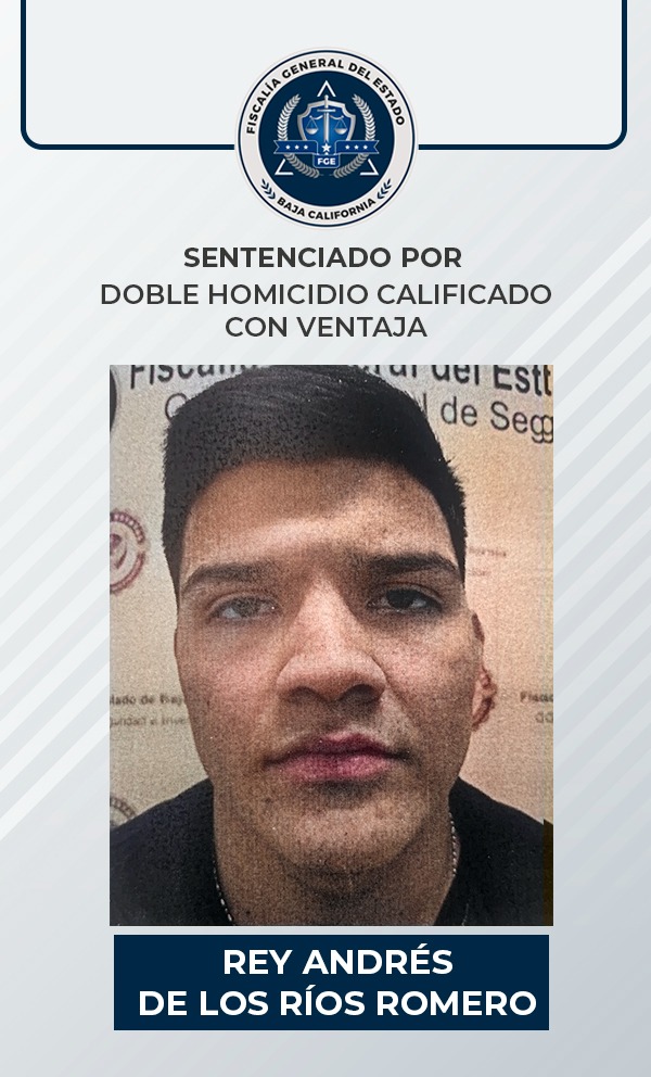 TIJUANA, B. C. - La Fiscalía General del Estado, a través de las pruebas y argumentos incriminatorios presentados por el agente del Ministerio Público ante un Juez de Control, logró que, por medio de un procedimiento abreviado, se impusiera una sentencia de 40 años de prisión a Rey Andrés De los Ríos Romero, alias “El Huevo”, por el delito de homicidio calificado con ventaja, en perjuicio de Javier y Marco Antonio.