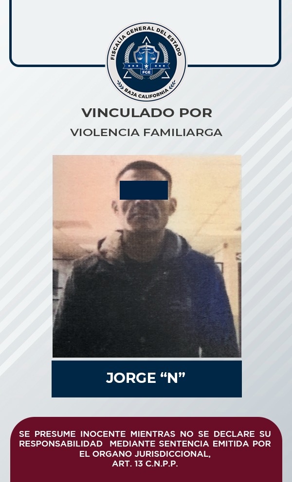 MEXICALI, B. C. - La Fiscalía General del Estado (FGE) a través de la Fiscalía Especializada en Delitos Contra Mujeres por Razón de Género, logró vincular a proceso a un imputado por el delito de violencia familiar.