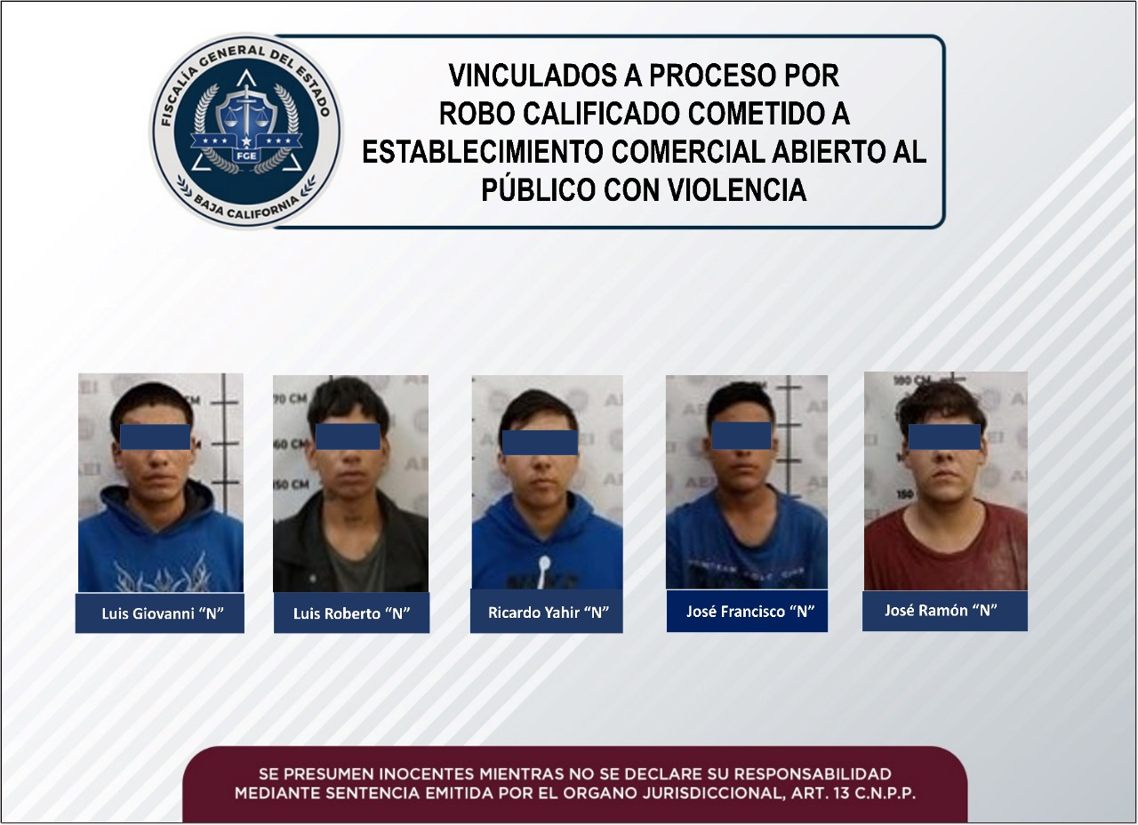 MEXICALI, B. C. - Por el delito de robo calificado cometido a establecimiento comercial abierto al público con violencia, la Fiscalía Regional de Mexicali obtuvo la vinculación a proceso de cinco jóvenes, tras un hecho ocurrido al poniente de la ciudad.
