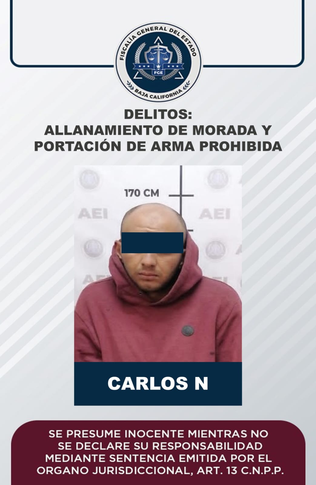 ENSENADA, B. C. - Por el delito de allanamiento de morada y portación de arma prohibida, la Fiscalía Regional de Ensenada obtuvo auto de vinculación a proceso en contra de Carlos “N”, detenido el 23 de octubre del presente año en el interior de un plantel educativo.