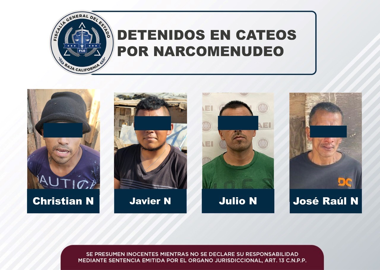 TIJUANA, B. C. - La Fiscalía General del Estado logró la detención de cuatro personas que pudieran estar relacionadas en delitos de narcomenudeo, ya que fueron aseguradas durante operativos de cateo contra la compra - enta de drogas, en donde se encontraron diversas cantidades de enervantes.