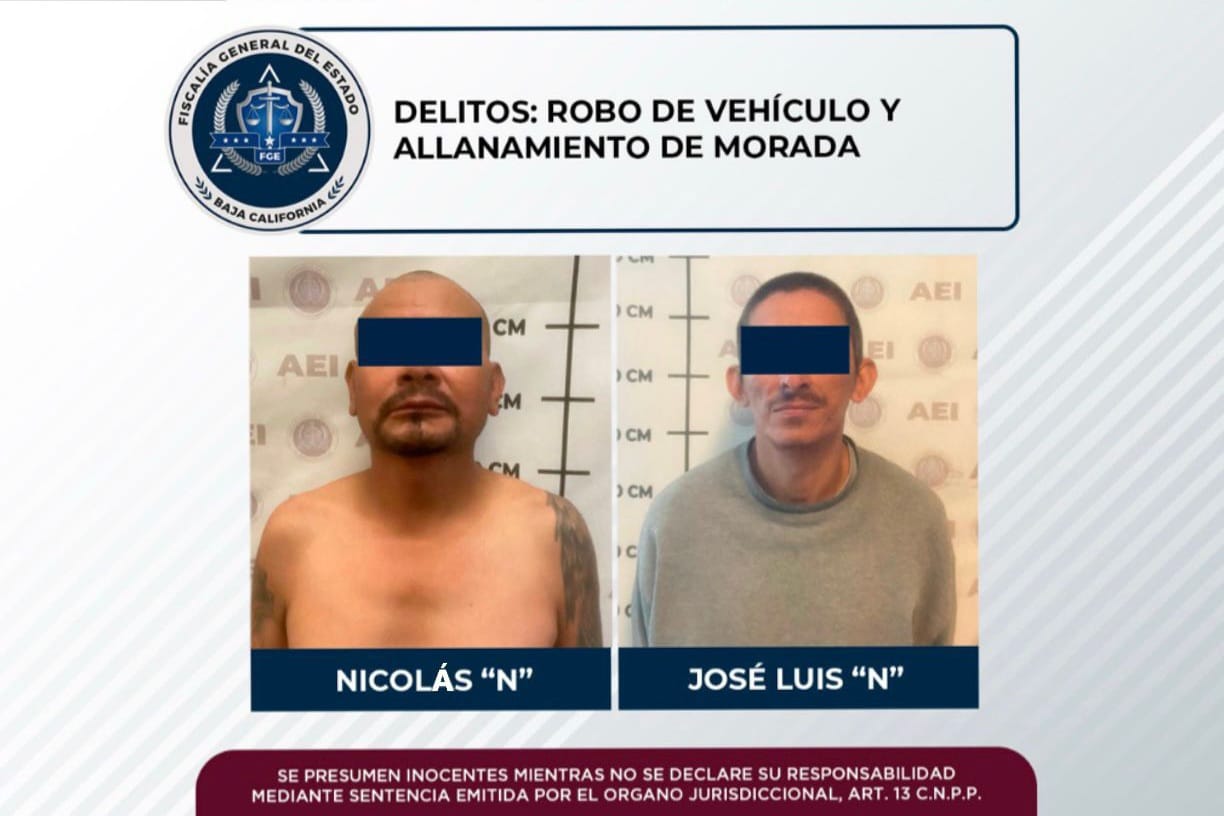 PLAYAS DE ROSARITO, B. C. - Como parte de las acciones de investigación en la persecución de los delitos, elementos de la Fiscalía General del Estado (FGE), cumplimentaron dos órdenes de aprehensión por allanamiento de morada y robo de vehículo.