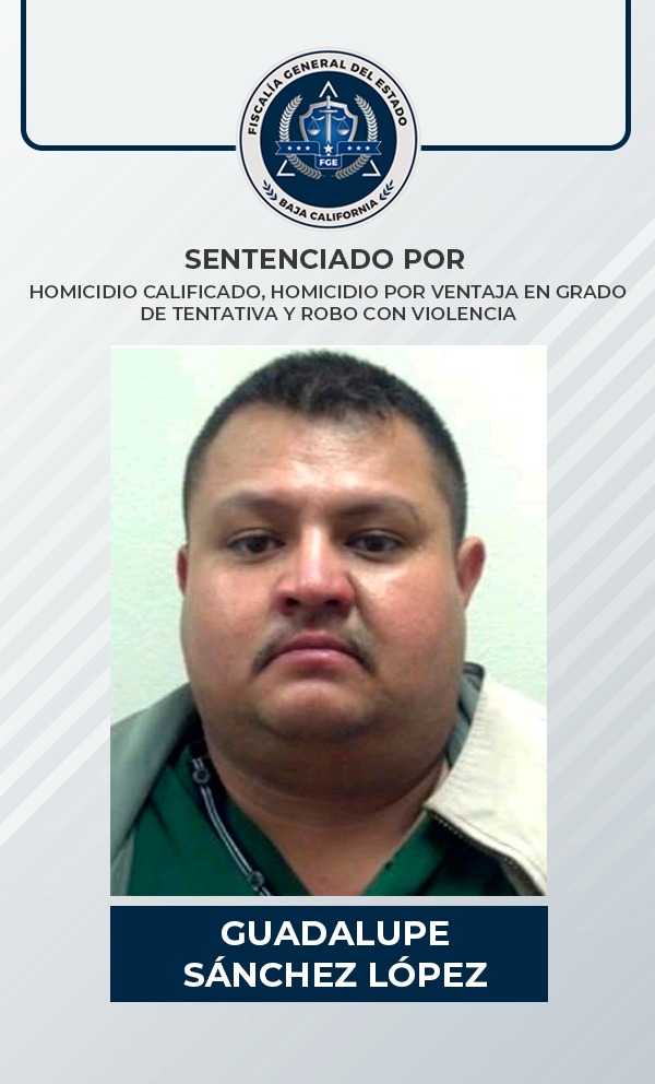 MEXICALI, B. C. - La Fiscalía General del Estado a través de la Fiscalía Especializada en Delitos contra la Vida obtuvo una sentencia de 43 años de prisión en contra de Guadalupe Sánchez López, al ser encontrado culpable de los delitos de homicidio calificado, homicidio calificado por ventaja en grado de tentativa y robo con violencia.