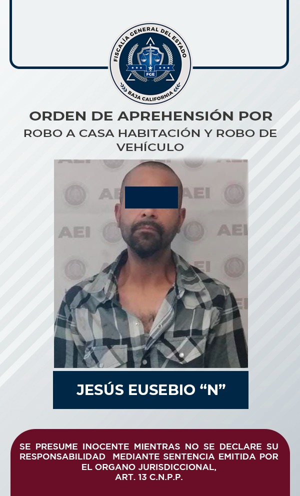 TECATE, B. C. - Agentes estatales de investigación de la Fiscalía Regional de Tecate, cumplimentaron una orden de aprehensión en contra de Jesús Eusebio “N”, por su probable responsabilidad en los delitos de robo calificado a casa habitación cometido por dos o más personas armadas y robo de vehículo con violencia.
