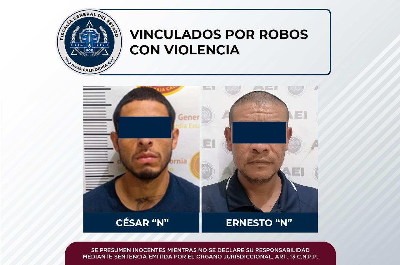 MEXICALI, B. C. - La Fiscalía Regional de Mexicali, a través de la Unidad de Investigación de Robos Oriente, logró con base a las pruebas y argumentos presentados, la vinculación a proceso de 2 hombres relacionados en los delitos de robo con violencia.