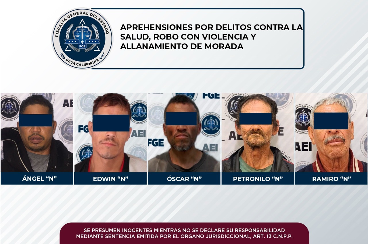 TIJUANA, B. C. - Elementos de la Agencia Estatal de Investigación de la Fiscalía General del Estado detuvieron a cinco personas, quienes contaban con diversas órdenes de aprehensión en casos separados, por lo que al momento de su detención fueron puestas a disposición del Juez de Control que obsequió el mandamiento judicial.