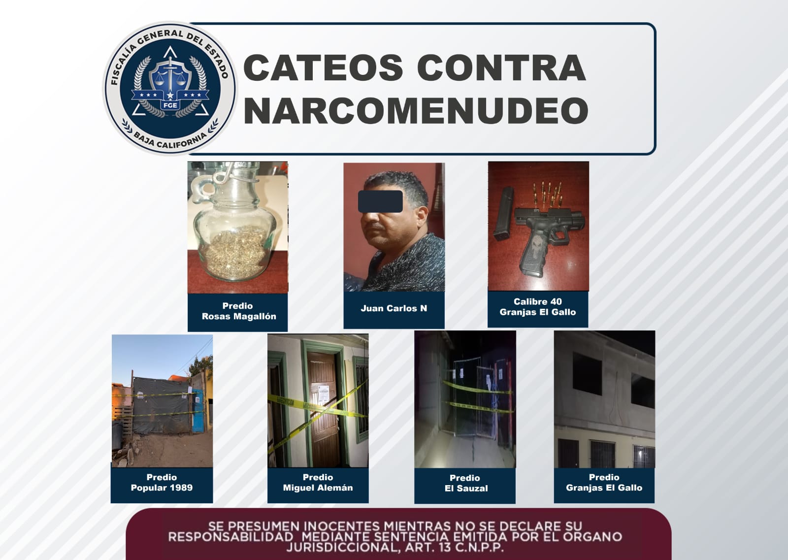 La tercera orden fue cumplimentada en una casa habitación ubicada en avenida Santa Rosalía, en la colonia Popular 1989, donde se encontró la cantidad de 6 envoltorios con un peso aproximado de 174 gramos de marihuana.