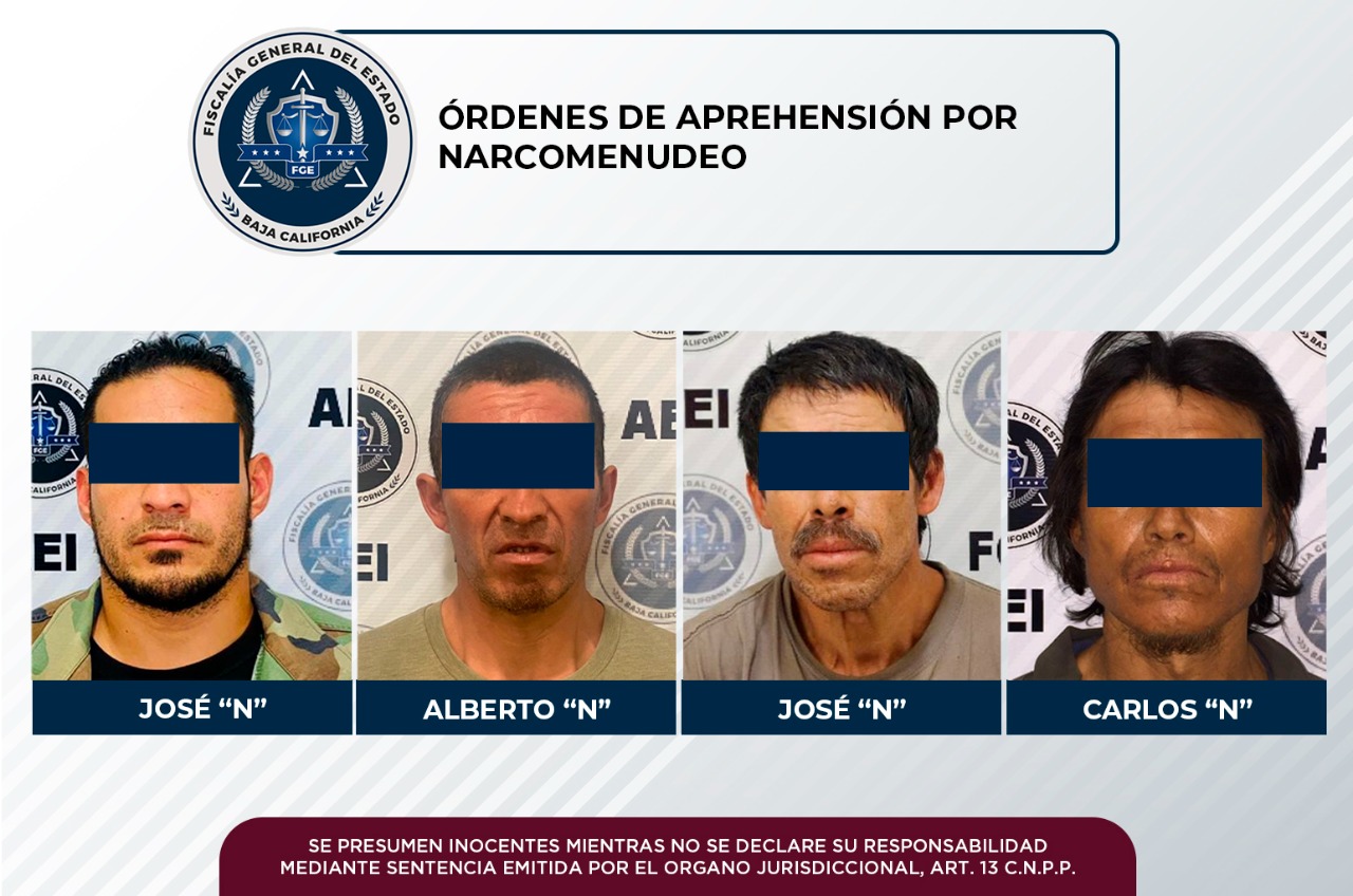 TIJUANA, B. C. - Por su presunta participación en delitos contra la salud, la Fiscalía General del Estado (FGE) a través de la Agencia Estatal de Investigación (AEI) cumplimentó, en hechos distintos, cuatro órdenes de aprehensión a igual número de personas.