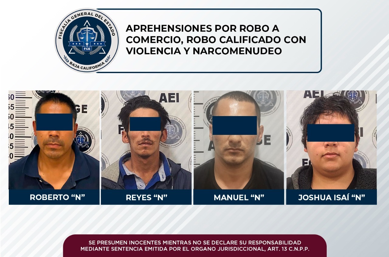 TIJUANA, B. C. - La Fiscalía General del Estado, a través de la Unidad de Aprehensiones de la Agencia Estatal de Investigación, logró la captura de cuatro sujetos, quienes eran requeridos por jueces de control, debido a que contaban con mandamientos judiciales en su contra.
