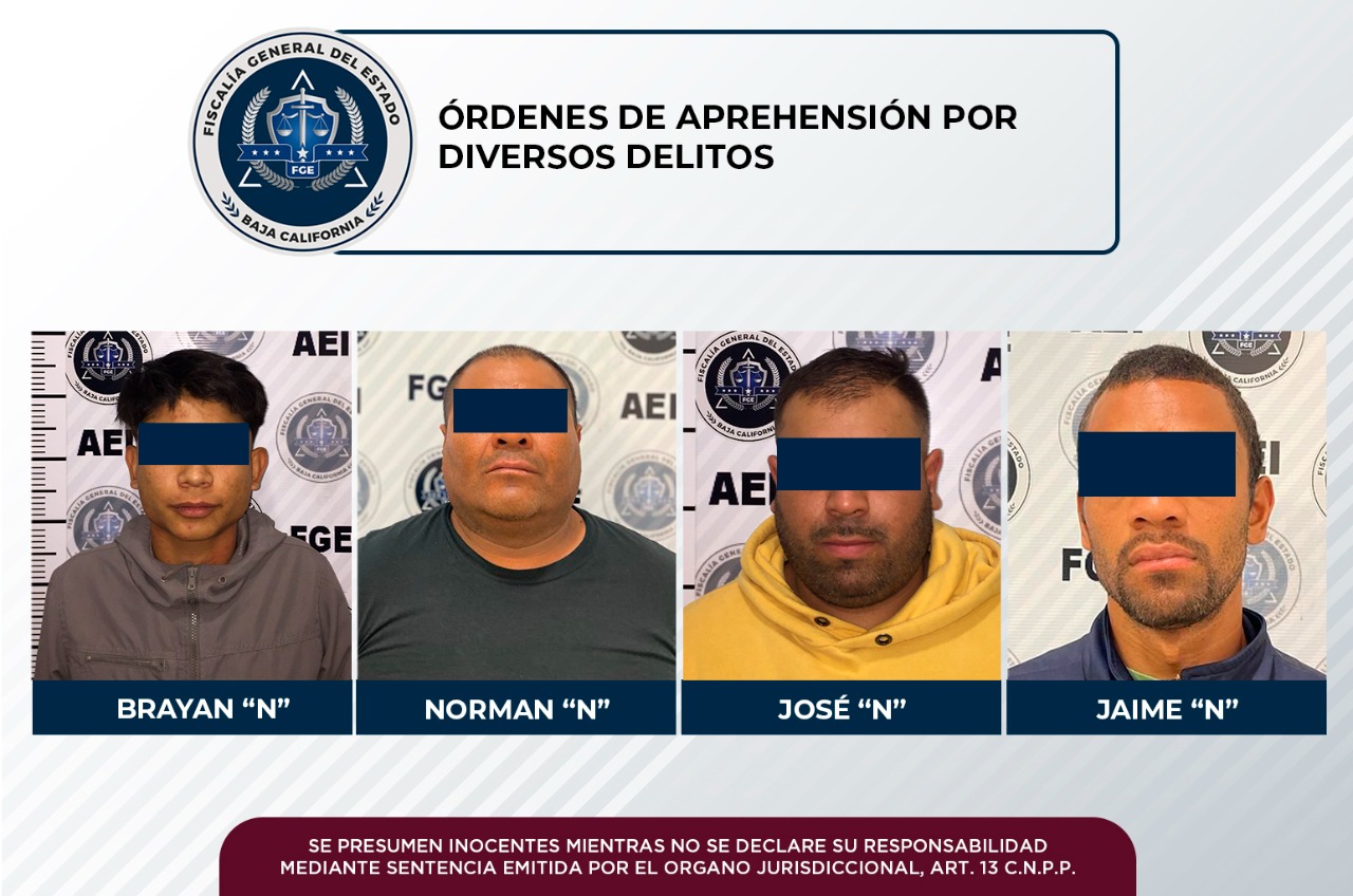 TIJUANA, B. C. - Por tener cuentas pendientes, cuatro sujetos fueron detenidos por elementos de la Fiscalía General del Estado (FGE), adscritos a la Agencia Estatal de Investigación (AEI), quienes dieron cumplimiento a las órdenes de aprehensión por diversos delitos.