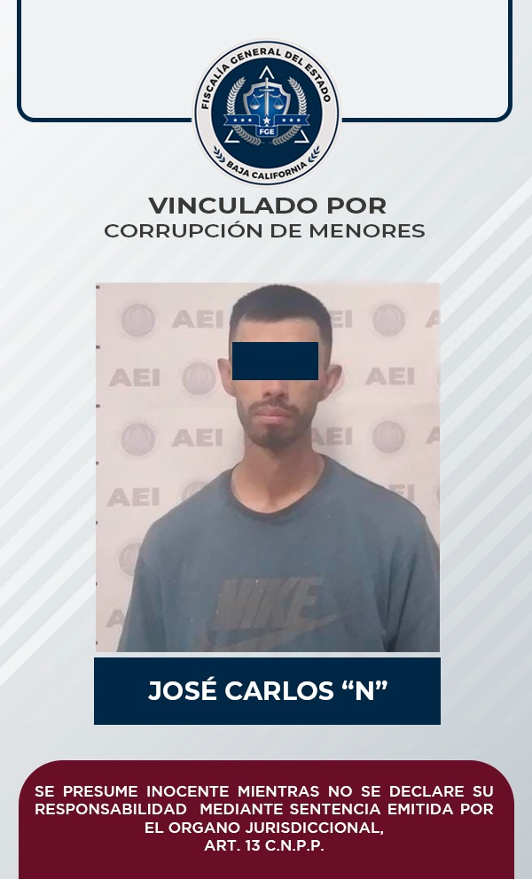 TECATE, B. C. - La Fiscalía General del Estado (FGE), a través de la Fiscalía Especializada en Delitos Contra Mujeres por Razón de Género, obtuvo la vinculación a proceso en contra de José Carlos “N” por ser probable responsable del delito de corrupción de personas menores de 18 años agravado.