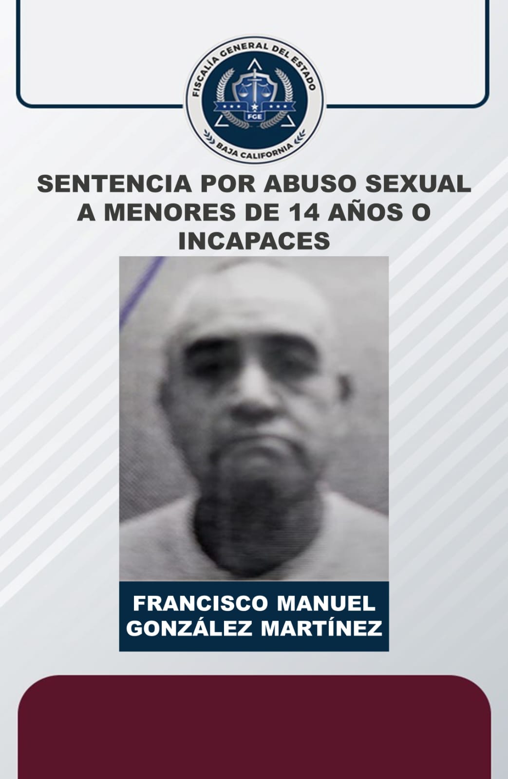 ENSENADA, B. C. - La Fiscalía General del Estado (FGE), obtuvo una sentencia de 5 años 4 meses de prisión en contra de Francisco Manuel González Martínez, quien se encuentra detenido desde el 24 de enero del presente año, por el delito de abuso sexual a menores de 14 años o incapaces.