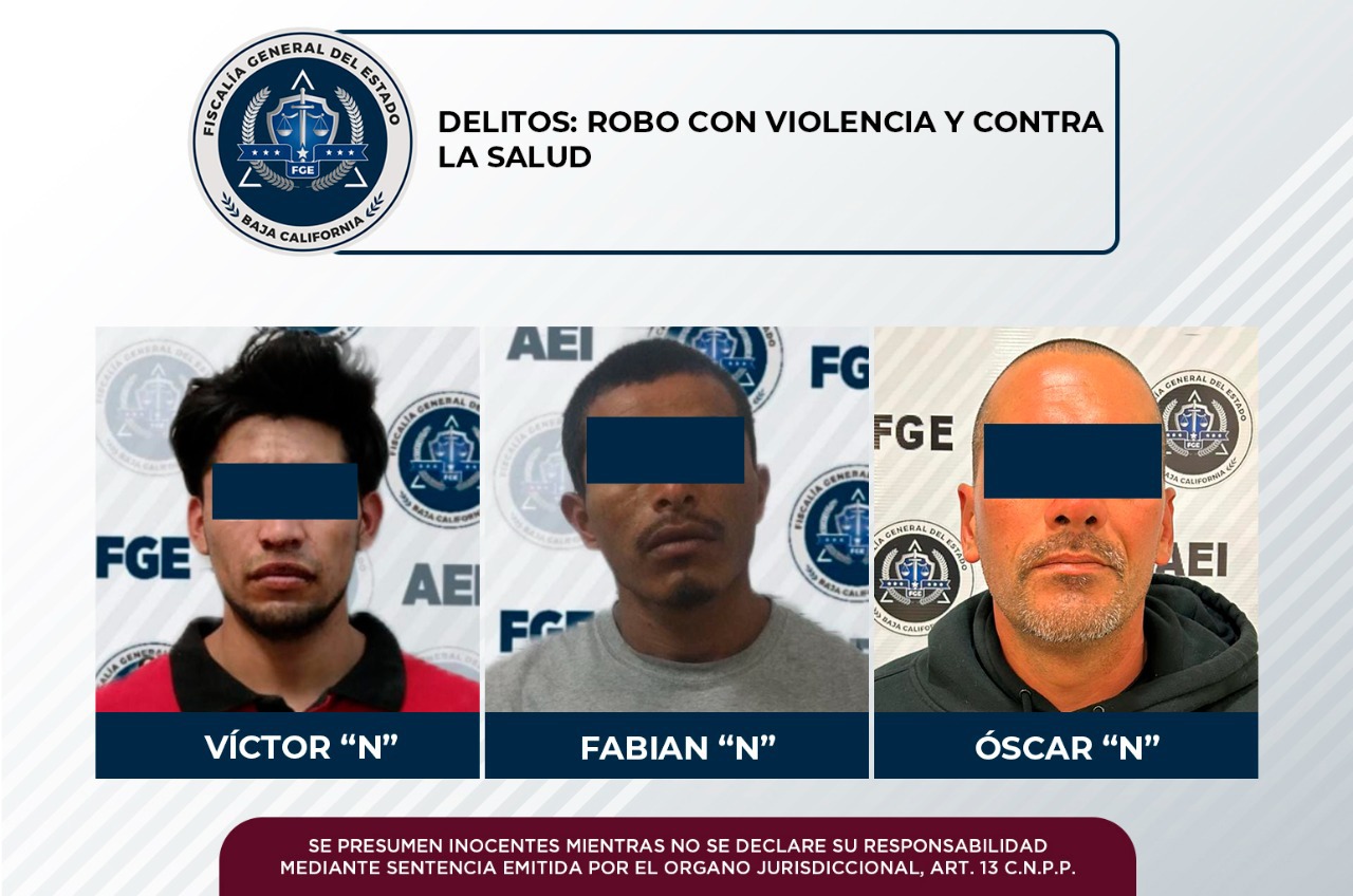 TIJUANA, B. C. - Por robo con violencia y narcomenudeo, tres hombres fueron aprehendidos por elementos de la Fiscalía General del Estado, pertenecientes a la Agencia Estatal de Investigación (AEI) quienes cumplimentaron las órdenes de aprehensión por los delitos que se les señala.