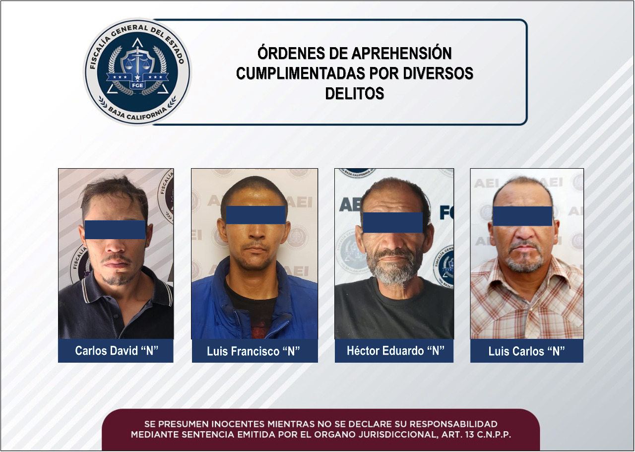 MEXICALI, B.C. - Dando continuidad a las investigaciones, elementos de la Agencia Estatal de Investigación (AEI), aseguraron a cuatro hombres que contaban con orden de aprehensión por delitos de robo en diferentes modalidades y allanamiento de morada.