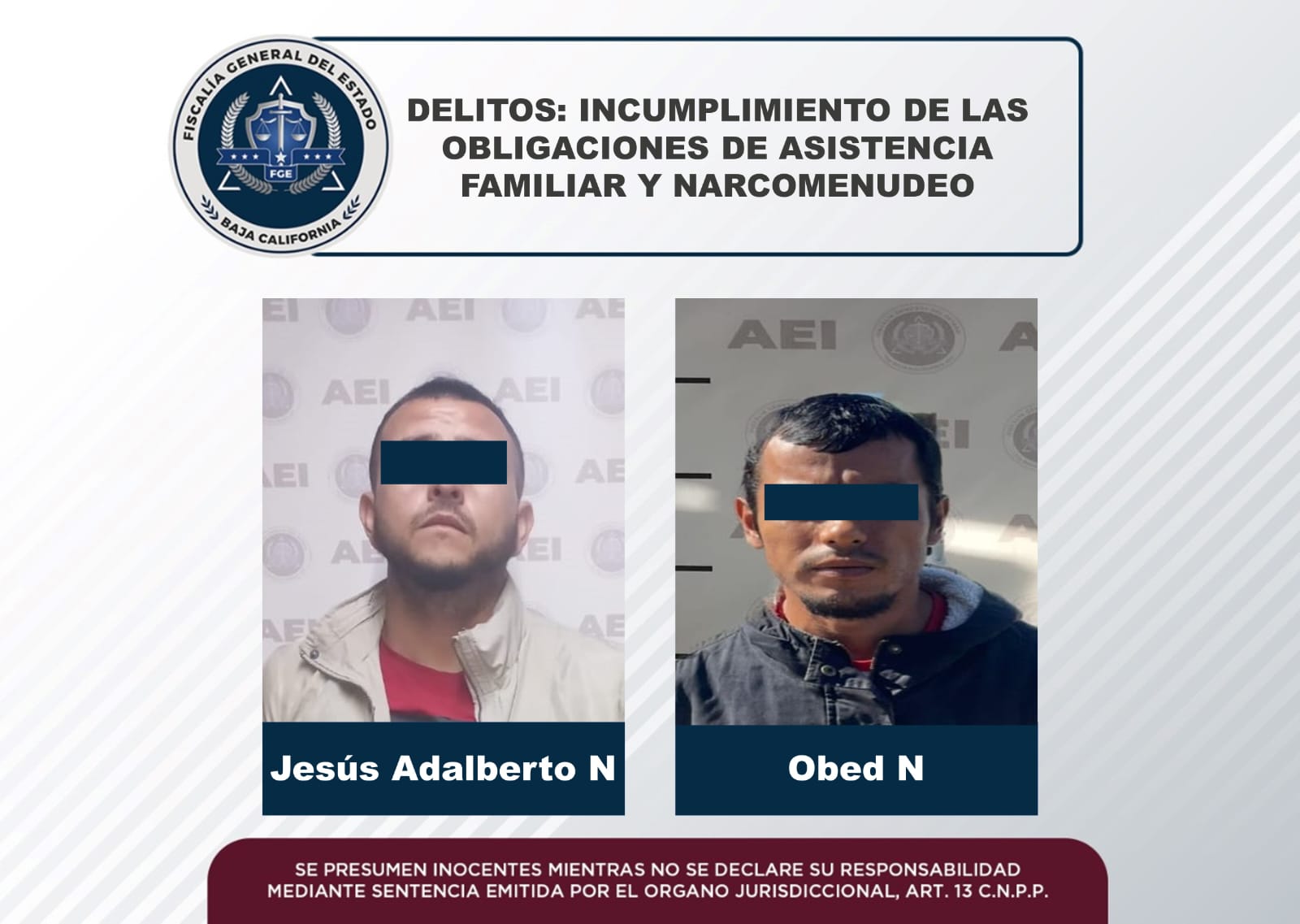 ENSENADA, B.C. - Por el delito de incumplimiento de las obligaciones de asistencia familiar, elementos de la Fiscalía General del Estado (FGE) cumplimentaron una orden de aprehensión en contra de Jesús Adalberto “N”, además, los agentes de la FGE aseguraron a otro hombre que contaba con un mandato judicial por el delito de narcomenudeo.