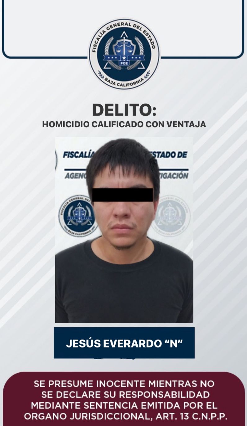 TIJUANA, B.C. - Como resultado de las indagatorias y pruebas obtenidas por la Fiscalía General del Estado (FGE), un juez decretó auto de vinculación a proceso y medida cautelar de prisión preventiva oficiosa en contra de Jesús Everardo "N", de 26 años de edad, por su probable participación en el delito de homicidio calificado con ventaja, tras hechos ocurridos el 4 de noviembre del año en curso.