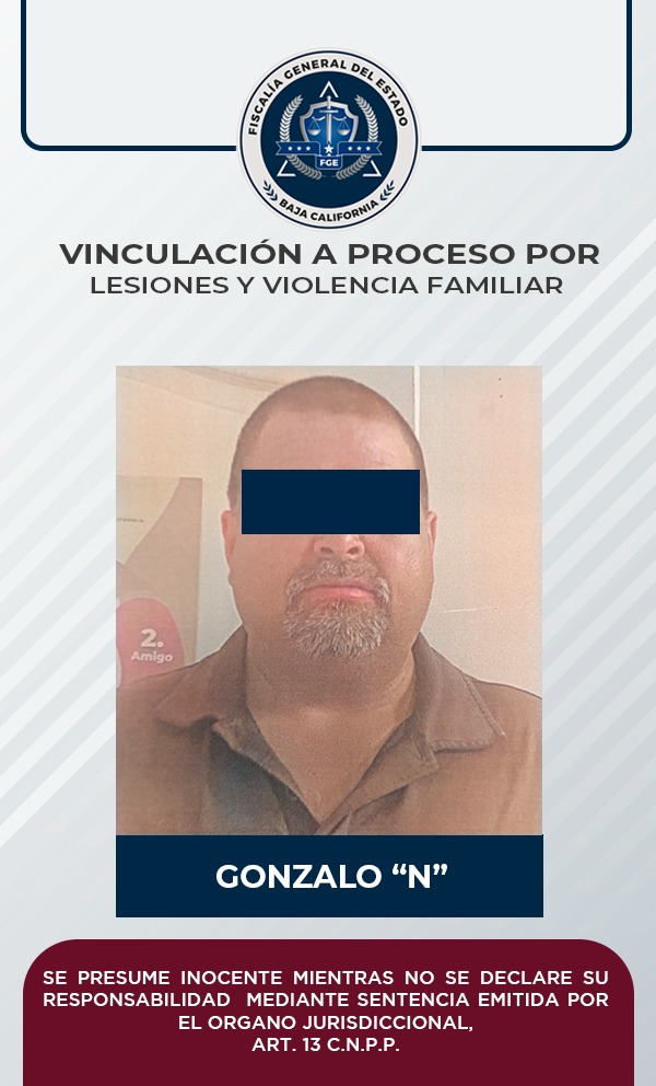 PLAYAS DE ROSARITO, B.C. - Por los delitos de lesiones y violencia familiar, la Fiscalía General del Estado, logró, mediante elementos de prueba, la vinculación a proceso de un hombre que responde al nombre de Gonzalo “N”.