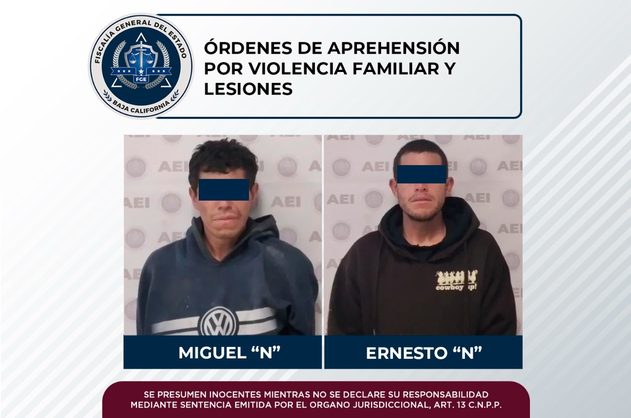 TECATE, B.C. - Por contar con orden de aprehensión por los delitos de violencia familiar y lesiones, dos hombres fueron capturados por agentes estatales de investigación de la Fiscalía General del Estado (FGE); ambos se encuentran a disposición del Juez de Control que emitió dichos mandatos judiciales.
