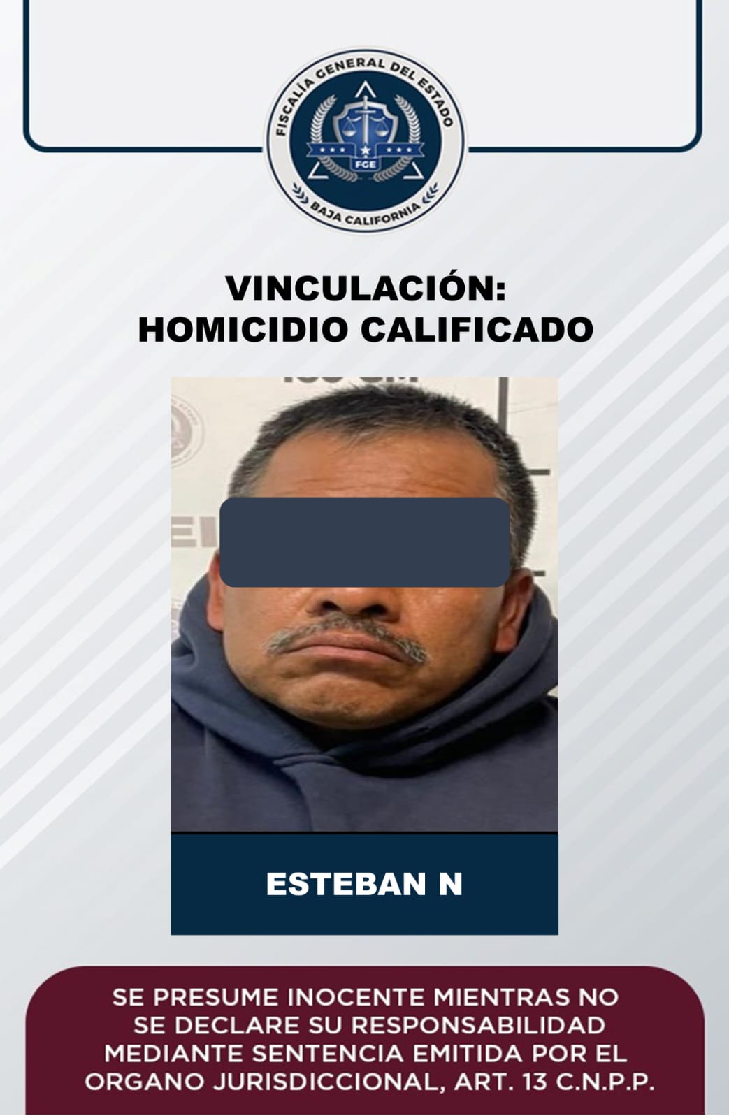 SAN QUINTÍN, B.C. - La Fiscalía General del Estado (FGE), obtuvo auto de vinculación a proceso penal contra Esteban “N”, de 58 años de edad, por el delito de homicidio calificado, tras hechos sucedidos el 1 de noviembre del año en curso.