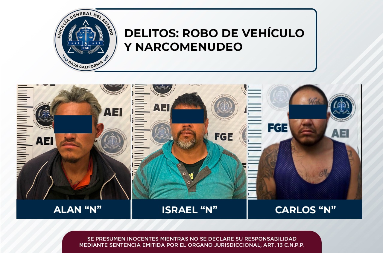 TIJUANA, B. C. - Tras acciones desarrolladas en gabinete y campo, agentes investigadores de la Fiscalía General del Estado (FGE) lograron cumplimentar orden de aprehensión a tres hombres que están señalados por su probable participación en los delitos de robo de vehículo y narcomenudeo.