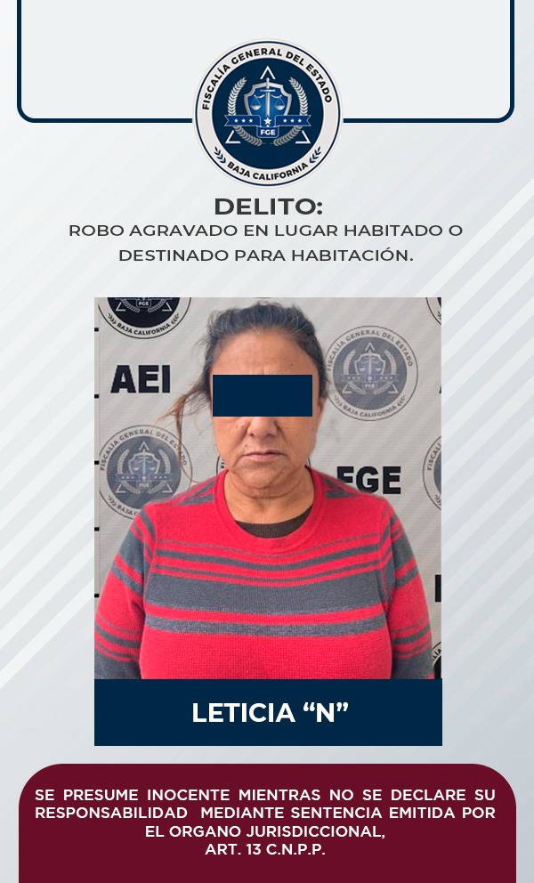 TIJUANA, B.C.- Como resultado de labores de coordinación entre instituciones de procuración de justicia, elementos de la Fiscalía General del Estado de esta entidad, lograron ubicar en Tijuana a una mujer con orden de aprehensión vigente en Baja California Sur, por el delito de robo agravado en lugar habitado o destinado para habitación.