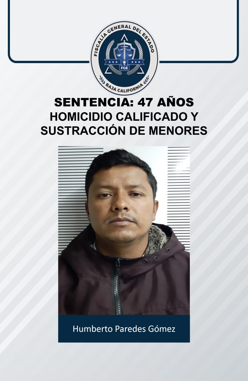 ENSENADA, B.C. - Mediante métodos de investigación para esclarecer hechos, a fin de que los responsables de cualquier delito sean procesados ante la justicia, y lograr cero impunidad en nuestro Estado, la Fiscalía General del Estado (FGE), obtuvo, en este caso, sentencia condenatoria de 47 años de prisión contra un homicida, quien además, intentó sustraer a una menor de 8 años en el puerto de Ensenada.