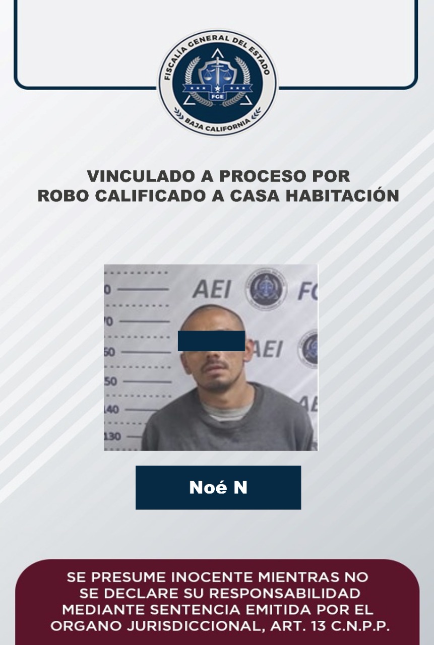 MEXICALI, B.C. - La Fiscalía Regional de Mexicali, a través del trabajo realizado por la Unidad de Investigación de Delitos de Robos Poniente, logró la vinculación a proceso penal en contra de Noé “N”, quien presuntamente cometió el delito de robo calificado a casa habitación.