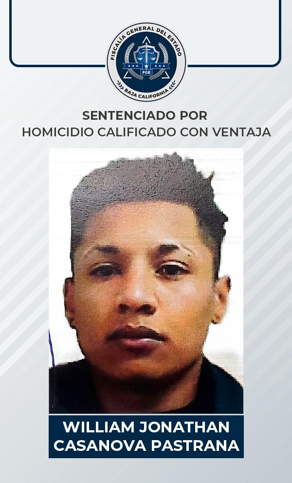 TIJUANA, B.C. - La Fiscalía General del Estado, a través del agente del Ministerio Público adscrito a la Fiscalía Especializada en Delitos Contra la Vida, logró una sentencia condenatoria de 45 años de prisión en contra de William Jonathan Casanova Pastrana, por ser penalmente responsable del delito de homicidio calificado con ventaja, en agravio de un hombre.