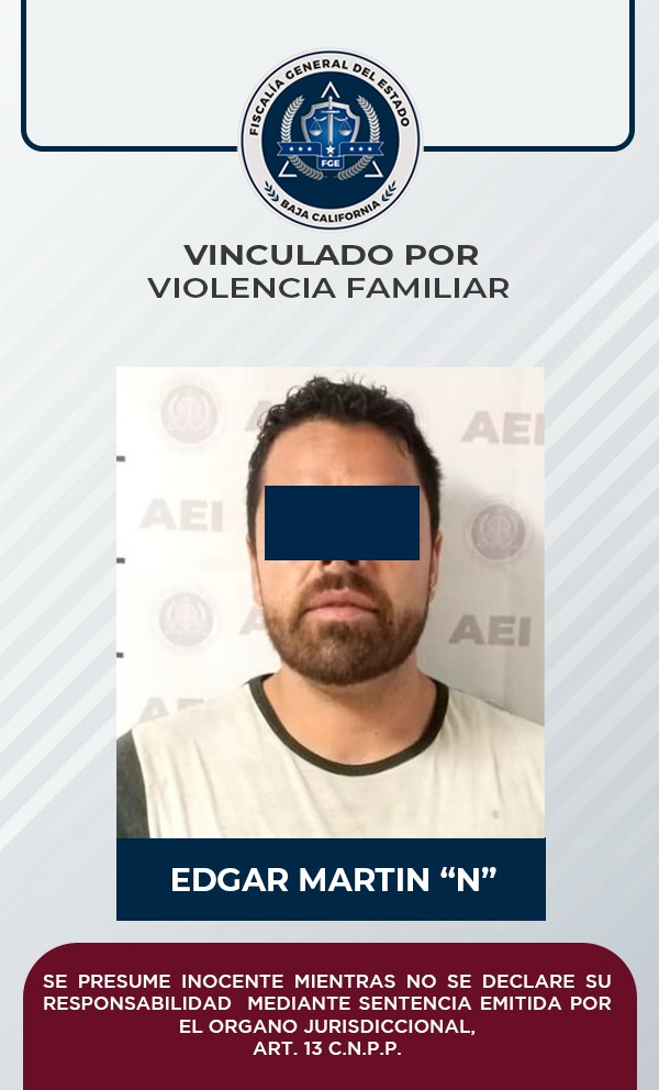 TECATE, B.C. - La Fiscalía General de Baja California informa sobre la vinculación a proceso de Edgar Martin “N”, acusado del delito de violencia familiar y quien se encuentra en prisión preventiva en tanto concluyen las investigaciones.