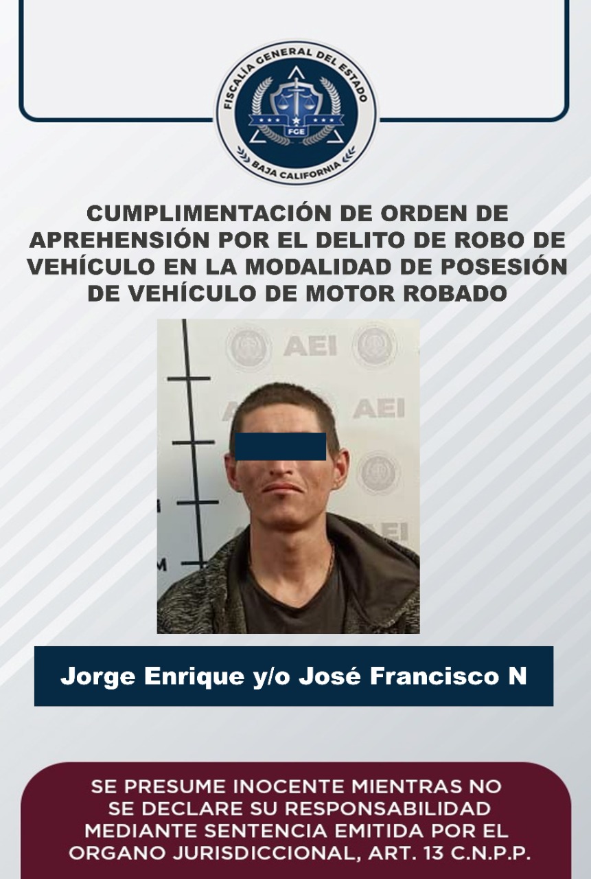 MEXICALI, B.C. - La Agencia Estatal de Investigación (AEI), adscrita a la Fiscalía Regional de Mexicali, mediante un trabajo de integración de carpeta de investigación, a cargo de la Unidad de Investigación de Delitos contra Robo de Vehículos, logró la ubicación de Jorge Enrique y/o José Francisco “N”, quien contaba con una orden de aprehensión.