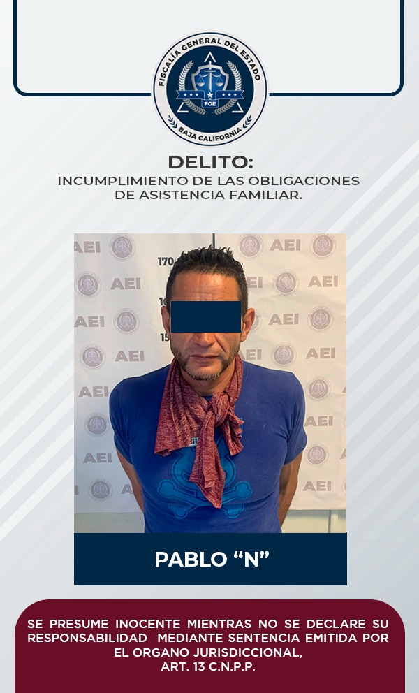 PLAYAS DE ROSARITO, B.C. - Agentes de la Fiscalía General del Estado, lograron cumplimentar una orden de aprehensión que se encontraba activa y fue emitida por un juez, en contra de Pablo “N”, por el delito de incumplimiento de las obligaciones de asistencia familiar.