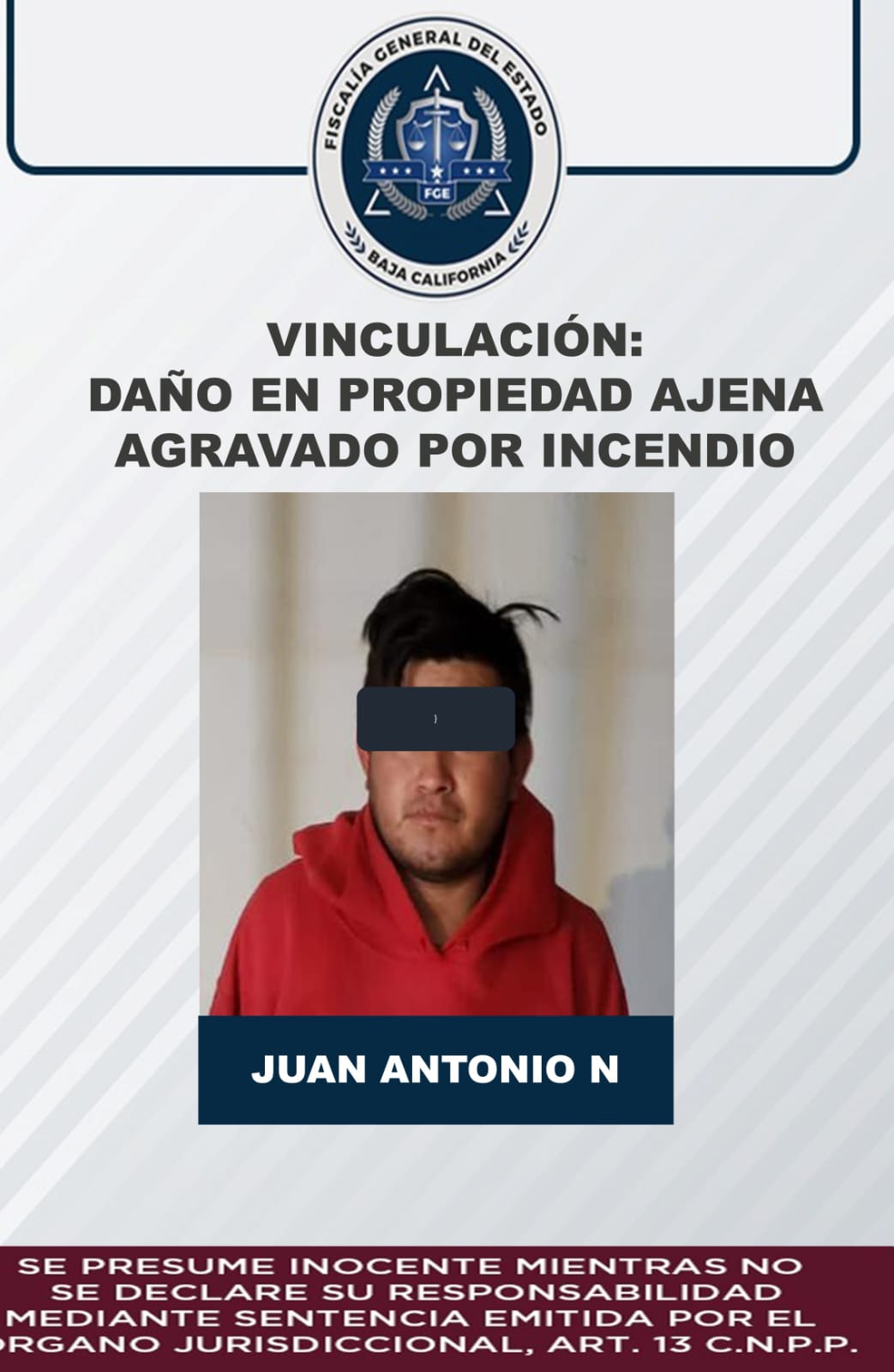 SAN QUINTÍN, B.C. - La Fiscalía General del Estado (FGE), logró vinculación a proceso en contra de Juan Antonio “N”, presuntamente responsable del incendio de 6 unidades de la Policía Municipal, suscitado el 14 de noviembre de 2022.