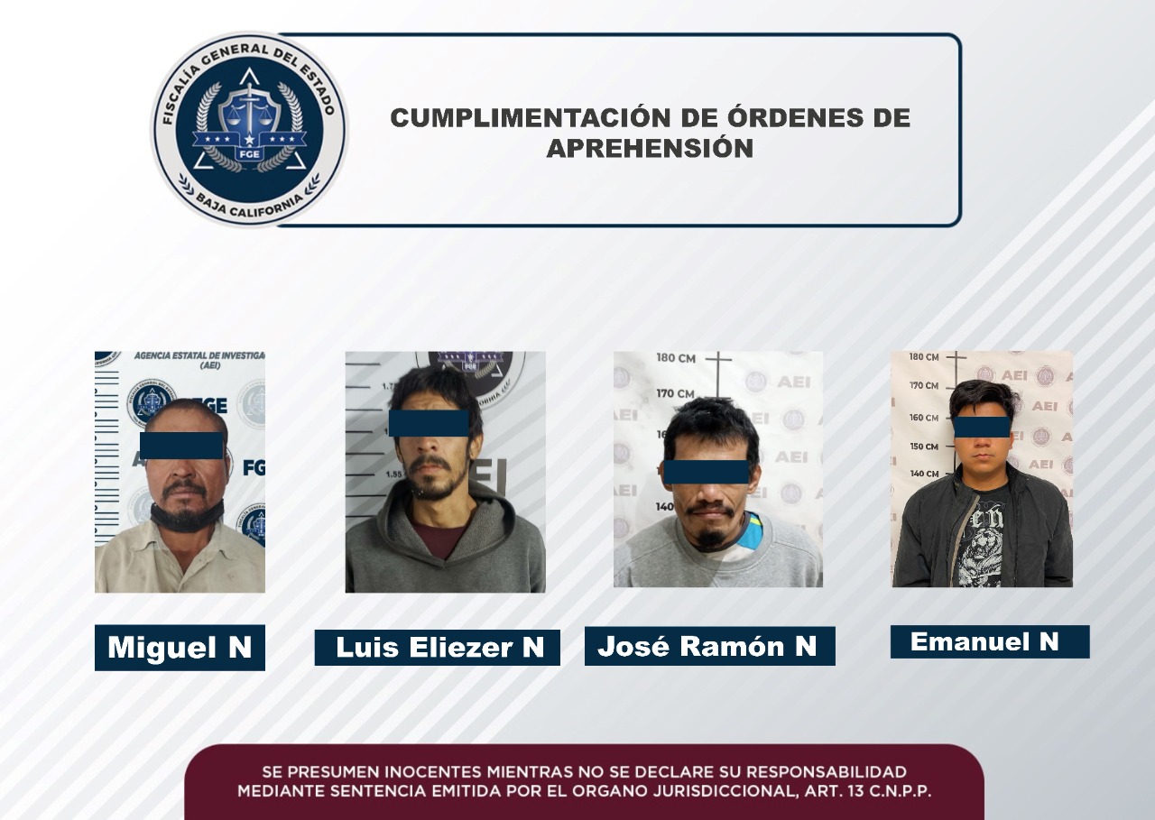 MEXICALI, B.C. - La Fiscalía Regional de Mexicali, a través de la Agencia Estatal de Investigación (AEI), en diligencias distintas, logró la detención de cuatro hombres que contaban con orden de aprehensión por presuntamente haber cometido diversos delitos.