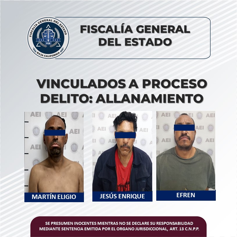 MEXICALI, B.C.- Tres hombres acusados por el delito de allanamiento de morada, fueron vinculados a proceso con la medida cautelar de prisión preventiva, con base a los elementos de prueba presentados por la Fiscalía Regional de Mexicali, a través de la Unidad Foránea de Guadalupe Victoria.
