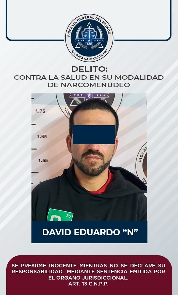 PLAYAS DE ROSARITO, B.C.- Agentes investigadores de la Fiscalía General del Estado, cumplimentaron una orden de aprehensión emitida por un juez de control, en contra de David Eduardo “N”, por su probable participación en el delito contra la salud, en su modalidad de narcomenudeo (posesión simple del psicotrópico denominado metanfetamina).
