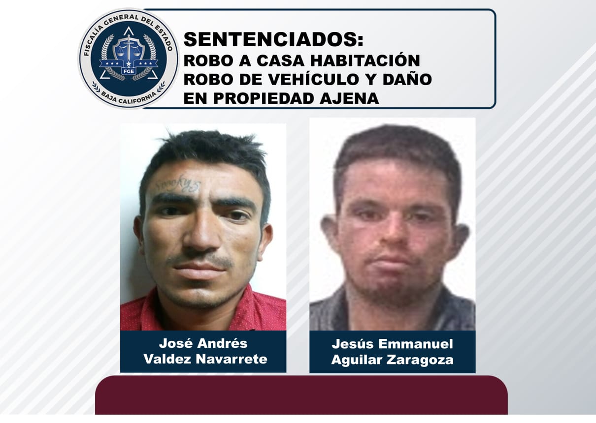 ENSENADA, B.C. - La Fiscalía Regional de Ensenada obtuvo en distintas audiencias dos sentencias condenatorias, una contra José Andrés Valdez Navarrete por la comisión de robo calificado a casa habitación, y otra para Jesús Emmanuel Aguilar Zaragoza por robo de vehículo ejecutado con violencia y daño en propiedad ajena por culpa.