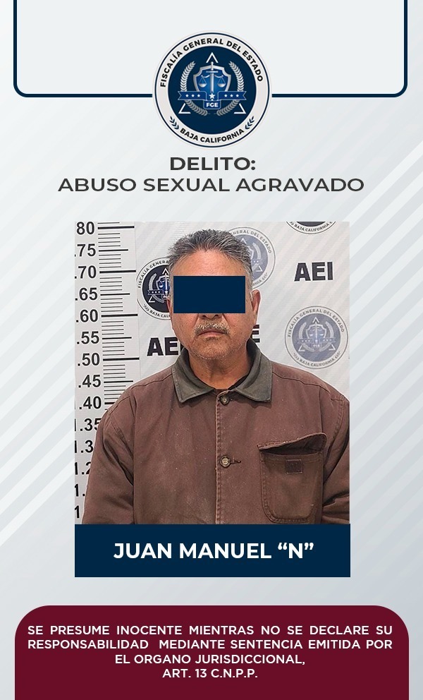 TIJUANA, B.C. - Como resultado de acciones conjuntas entre entidades federativas en materia de procuración de justicia, agentes investigadores de la Fiscalía General de Baja California, aprehendieron en Tijuana a Juan Manuel “N”, quien contaba con un mandamiento judicial activo en el Estado de Sinaloa, por el delito de abuso sexual agravado.